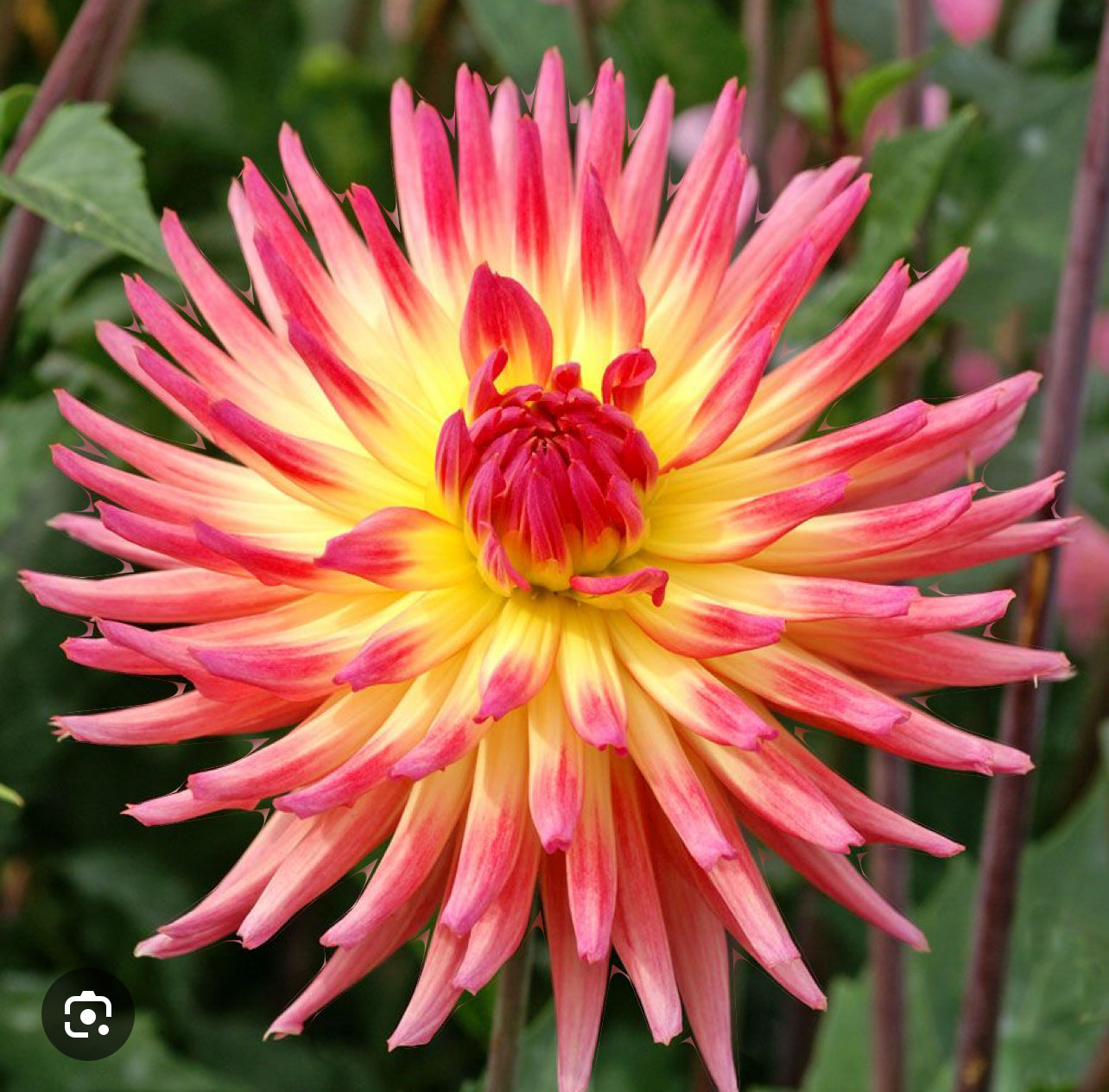 Karma Sangria has beautiful pink petals that yellow towards the center. This plant has the strongest stems I've seen in a dahlia. Works beautifully in bouquets.